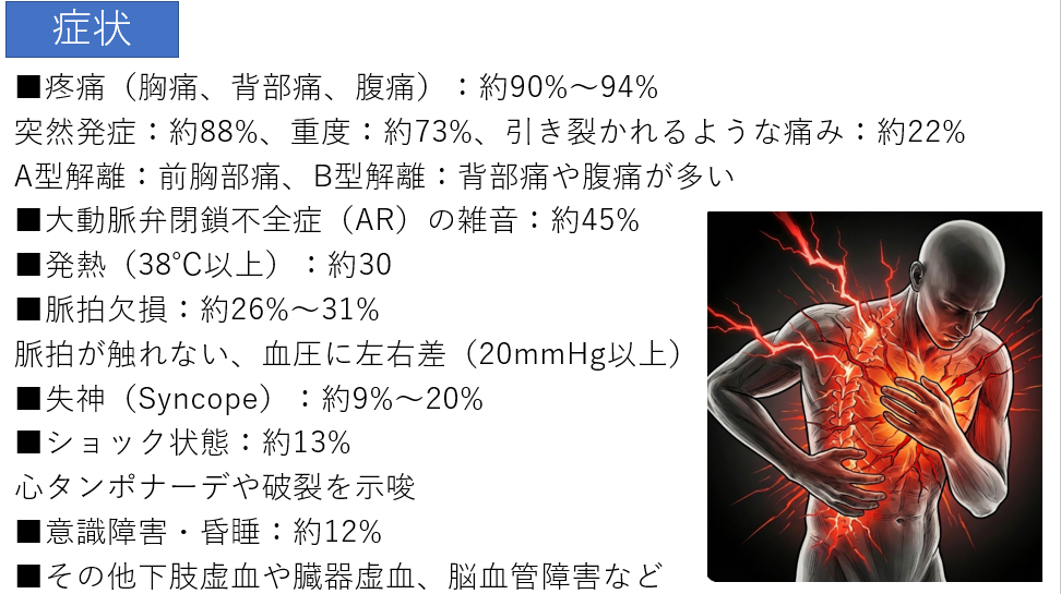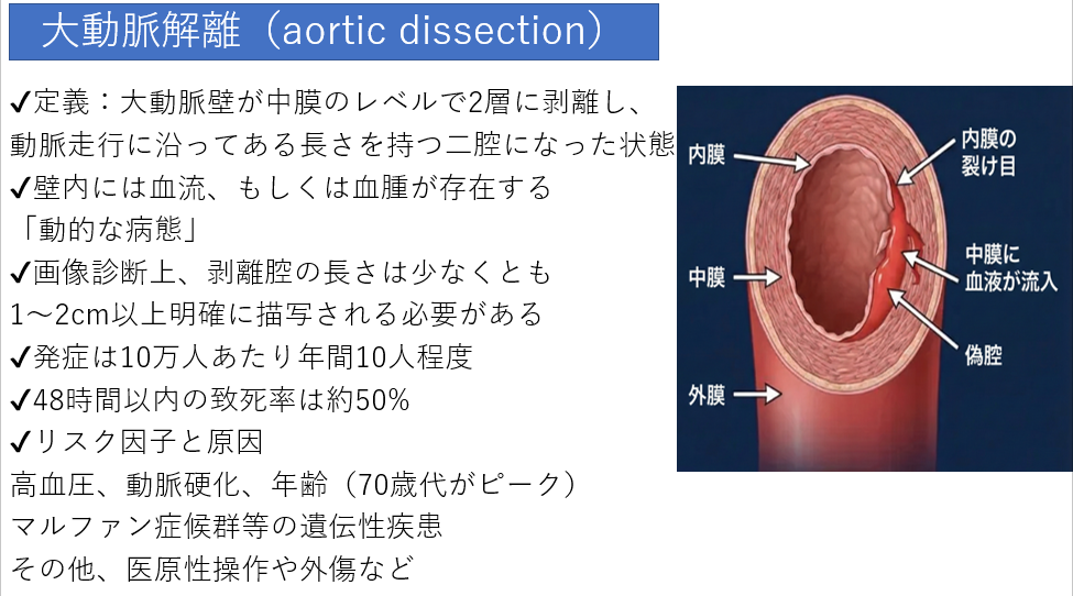 - 大動脈解離は、48時間以内の致死率50%の超緊急疾患。