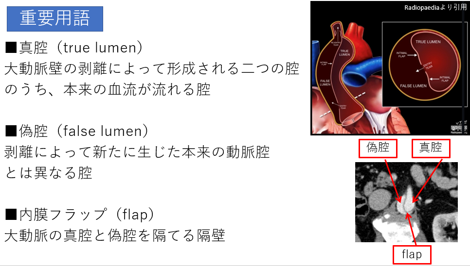 - 内膜フラップ: 真腔と偽腔を隔てている、剥がれた血管壁。CT画像では「ヒラヒラとしたカーテン」のような線状構造物として見えます。