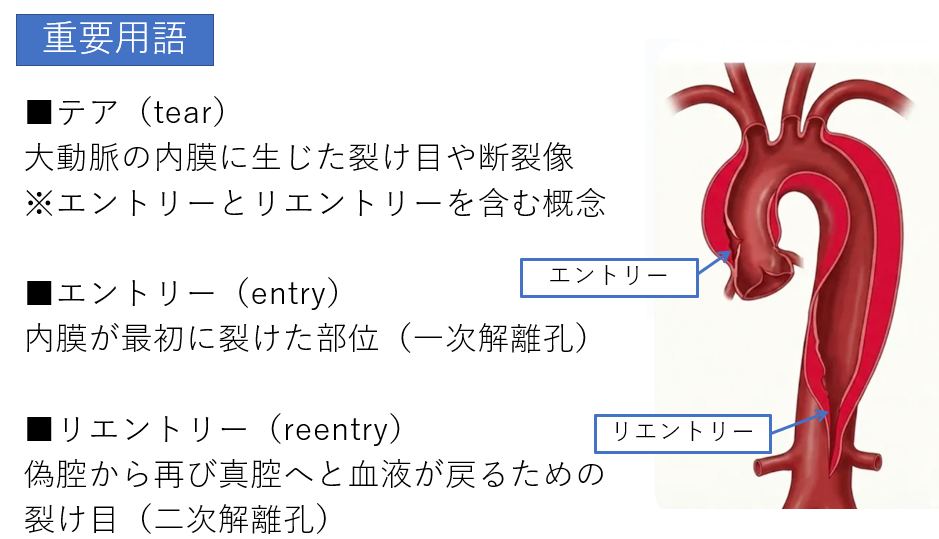 - エントリー(Entry / 一次解離): 血液が真腔から壁の中へと入り込む「最初の入り口」です。
