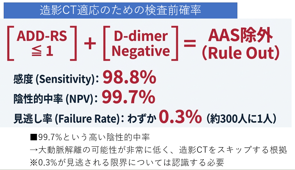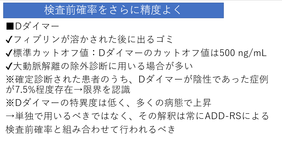 - 偽腔内の血栓形成により上昇します。ADDRSが1点以下かつDダイマー陰性の場合、解離の否定的中率は99.7%に達します。