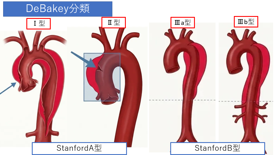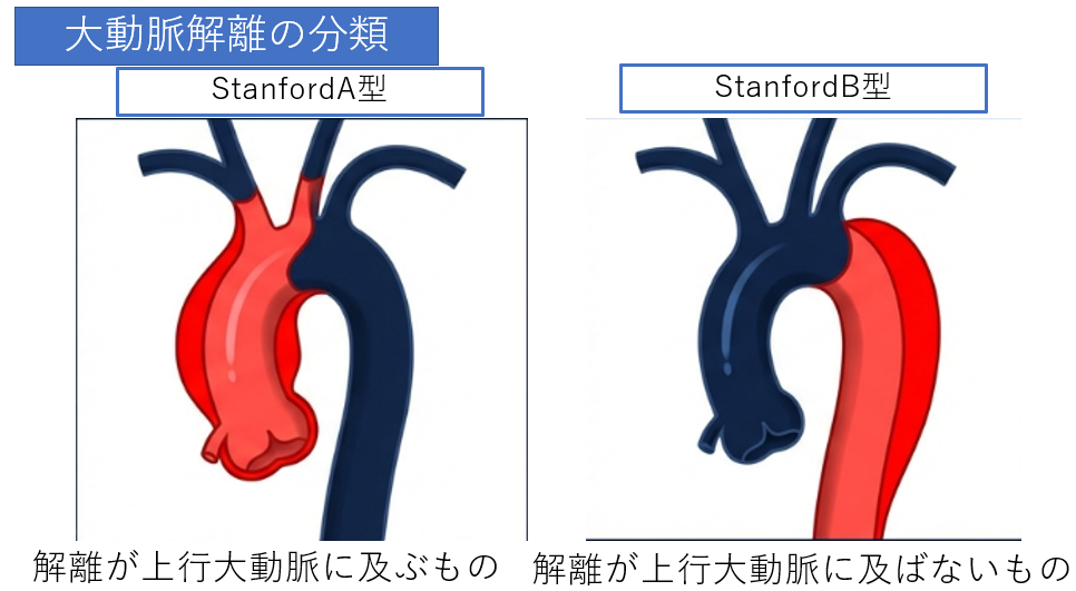 | Stanford A型 | 解離が上行大動脈に及んでいるもの | 緊急手術(人工血管置換術) |