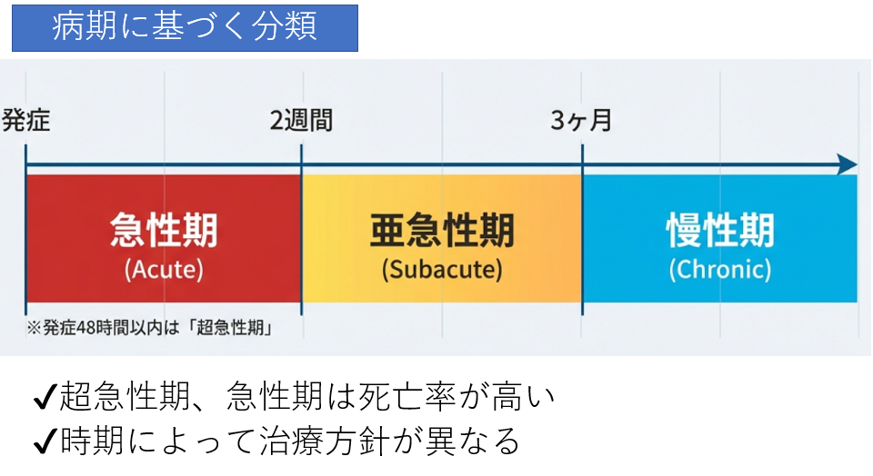 続いて、「病期に基づく分類」について見ていきましょう。これは発症からの経過時間によって定義され、発症から2週間までを「急性期」、2週間から3ヶ月までを「亜急性期」、それ以降を「慢性期」と呼びます。さらに、発症から48時間以内は「超急性期」として区別されることもあります。