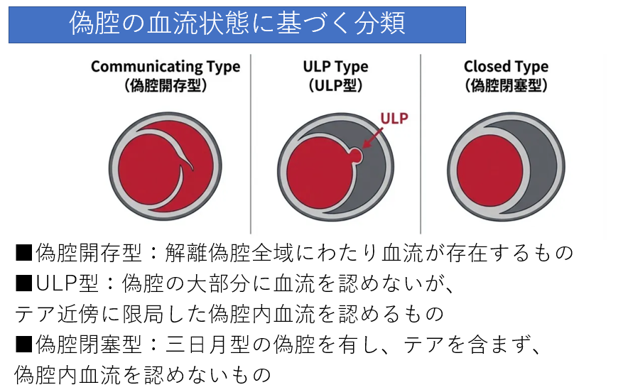 - 偽腔開存型: エントリーとリエントリーが繋がっており、偽腔内にも血流がある。