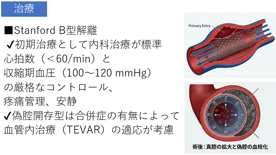 - Stanford B型: 基本的には内科的治療(降圧管理と安静)。ただし、臓器虚血などの合併症がある場合にはTEVARが検討されます。